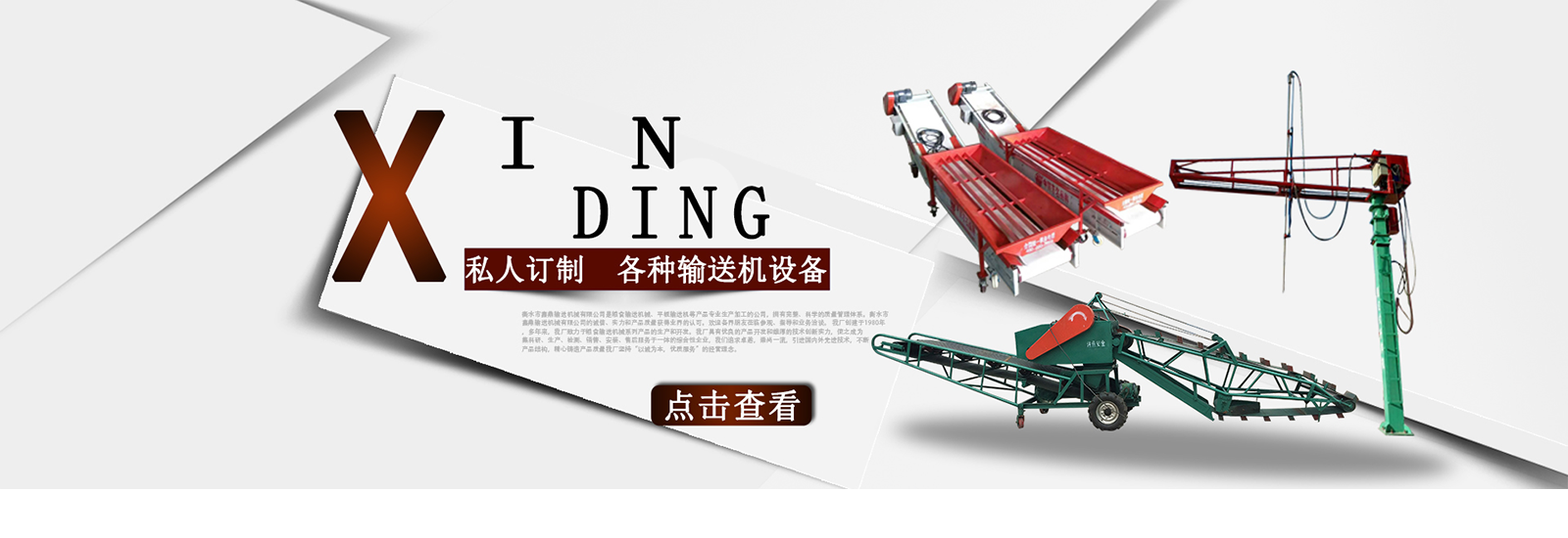 衡水市鑫鼎輸送機械有限公司是糧食輸送機械、平板輸送機等產(chǎn)品專業(yè)生產(chǎn)加工的公司,擁有完整、科學的質(zhì)量管理體系。衡水市鑫鼎輸送機械有限公司的誠信、實力和產(chǎn)品質(zhì)量獲得業(yè)界的認可。歡迎各界朋友蒞臨參觀、指導和業(yè)務洽談。 我廠創(chuàng)建于1980年,多年來,我廠致力于糧食輸送機械系列產(chǎn)品的生產(chǎn)和開發(fā)。我廠具有優(yōu)良的產(chǎn)品開發(fā)和雄厚的技術創(chuàng)新實力,使之成為集科研、生產(chǎn)、檢測、銷售、安裝、售后服務于一體的綜合性企業(yè),我們追求卓越,崇尚一流,引進國內(nèi)外先進技術,不斷產(chǎn)品結構,精心鑄造產(chǎn)品質(zhì)量我廠堅持“以誠為本,優(yōu)質(zhì)服務”的經(jīng)營理念。。積極拓展市場,贏得了廣大客戶的信賴和一致好評。產(chǎn)品暢銷山西、山東、遼寧、黑龍江、吉林、北京、天津、內(nèi)蒙古等28個省、市、自治區(qū)。